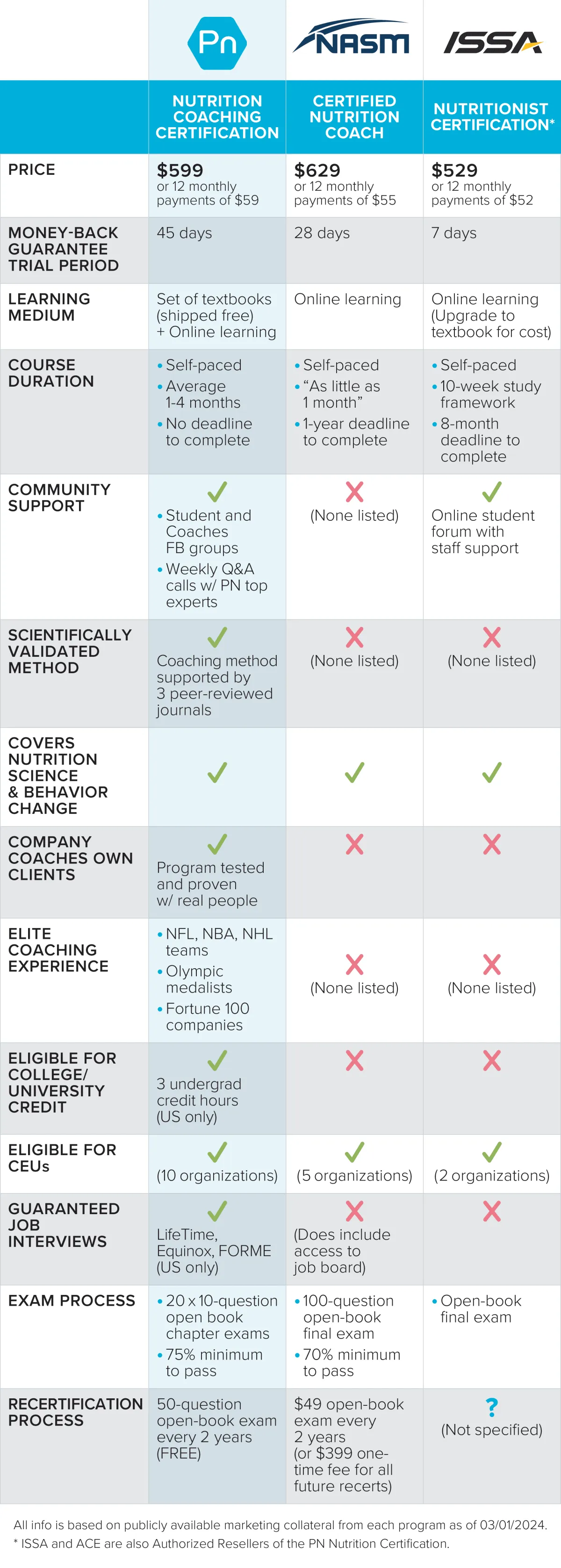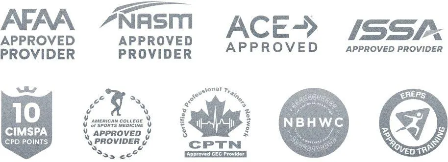 The PN Nutrition Certification qualifies for continuing education credits with the following organizations worldwide: NASM, ACSM, ACE, AFAA, CIMSPA, CDR, CPTN, EREPS, ISSA, NBHWC, and more.